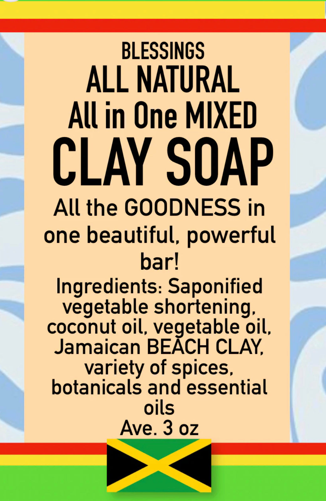 This All in One Mixed Clay soap has a beautiful selection botanicals and spices in a base filled with fresh clay from beaches in Jamaica! Clay absorbs toxins from the skin, and helps to balance oily skin.