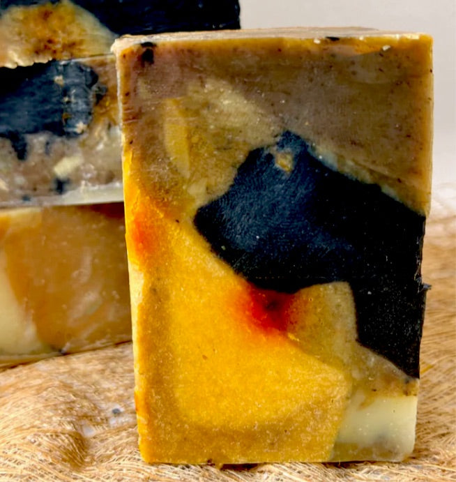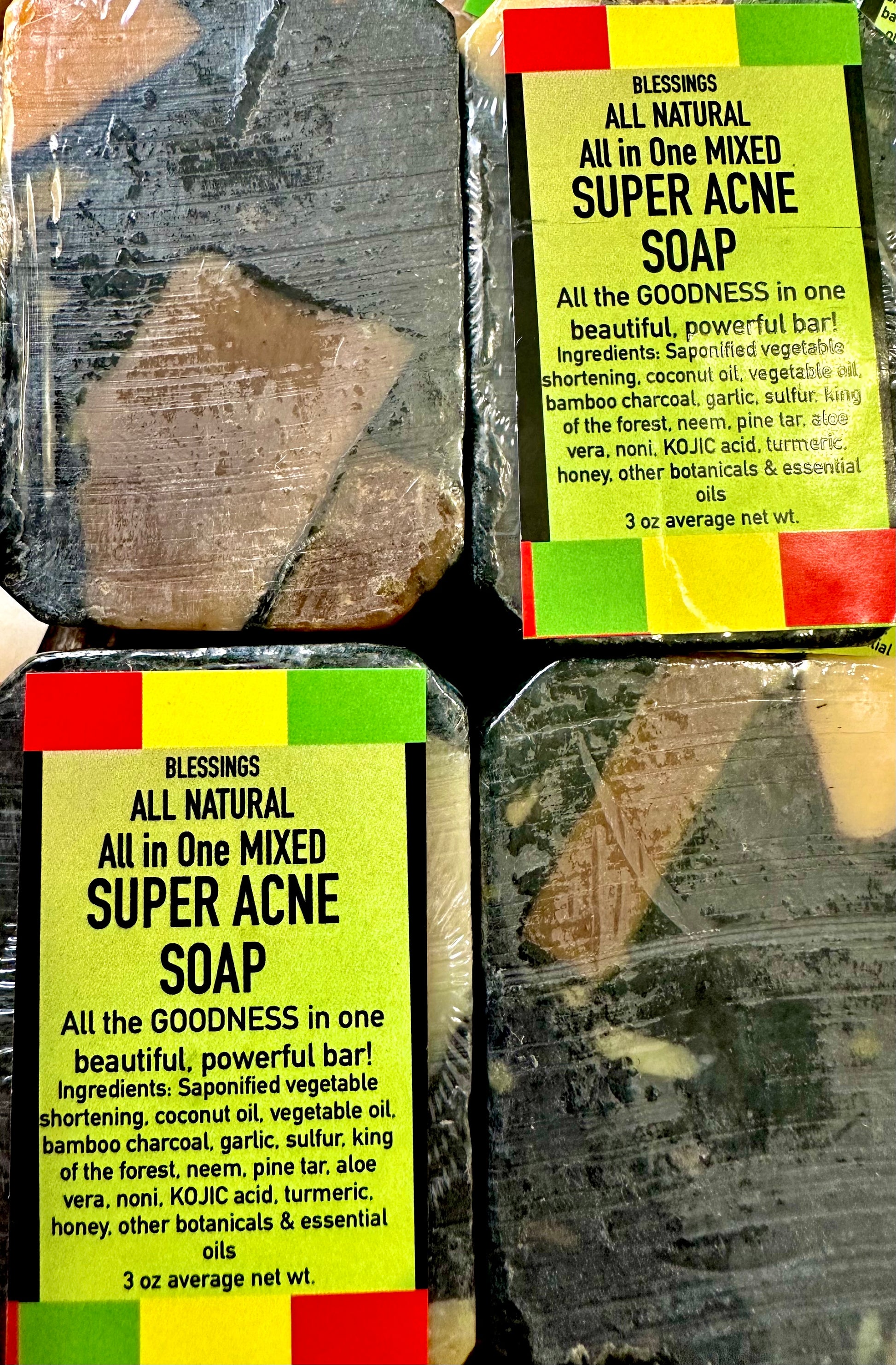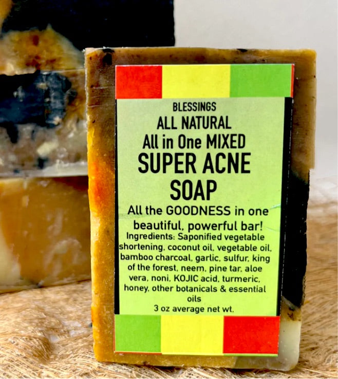 Acne where? This powerful bar is made of all of our soaps that helps to fight acne and support clear, healthy skin. Bamboo charcoal, turmeric, garlic, sulfur and neem are just some of the super-charged botanicals that make this combination bar a must-have for people who need to heal their skin. This bar even has Kojic acid to help against acne scarring.